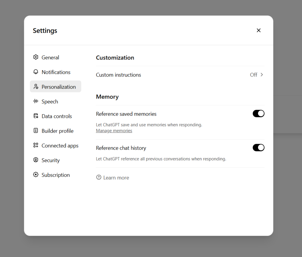 Eski kaydedilmiş anılar özelliğinin aksine, sohbet geçmişi belleği özelliği aracılığıyla kaydedilen bilgilere erişilemez veya bunlar ayarlanabilir değildir. Ya açıktır ya da değildir.