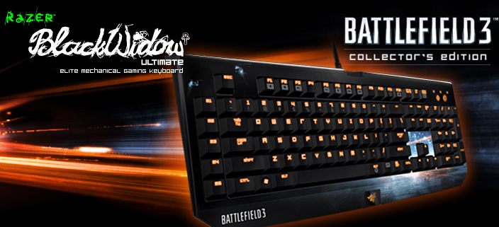 Oyuncular için hassas bir yapıya sahip Battlefield 3 Razer BlackWidow Ultimate klavyesi kırmızı-beyaz yanan tuş takımları ile hem görsel olarak hem de oyun deneyimi olarak en iyisini sunmak için hazırlanıyor. 25 Ekimde çıkacak ürünün fiyatı US $139.99 / EU €139.99 olarak belirlenmiş.