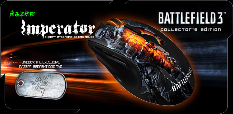 Kauçuk kaplaması, ergonomik yapısı ve 6400dpi’lık 4G Çift Sensör Sistemi ile oyuncuların anında tepki vermesini kolaylaştıran Battlefield 3 Razer Imperator programlanabilir yedi hassas tuşa sahip. 25 Ekimde çıkacak ürünün fiyatı US $79.99 / EU €79.99 olarak belirlenmiş.