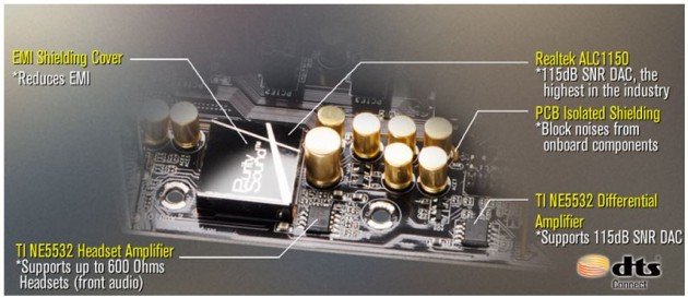 Purity Sound, birçok donanım ve yazılımın bir kombinasyonu olarak göze çarpıyor. Donanımsal açıdan 7.1 CH HD ses, 115dB SNR DAC destekleyen Realtek ALC1150 ses yongası ile sağlanırken, Diferansiyel Amplifikatör ve 600 ohm kulaklıkları destekleyen Premium Kulaklık Amplifikatörü olarak 2 adet TI NE5532 yükseltici kullanılmış. Ek olarak geleneksel kapasitörlerden farklı başlıksız kapasitör içeren Direct Drive teknolojisi, EMI kalkan koruması ve DTS Connect (DTS bağlantısı) desteği de bulunuyor.