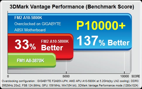 Üzerinde çift clock generator olan GigabyteF2A85X-UP4 anakart, Gigabyte yazılımı Easy Tune 6 ile sıvı nitrojen kullanılarak 5.2GHz hızında çalıştırılarak 10.000 üzeri 3DMark Vantage Performance skoru yaptı.
