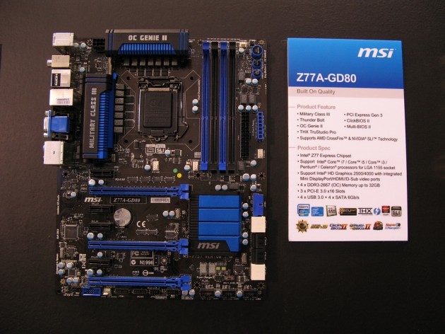 MSI, CES 2012 hazırlığı kapsamında Intel’in 22nm ölçekli Ivy Bridge kod adlı işlemcilerine zemin hazırlayan Z77 yongasetli anakartlarını sergiledi. MSI, Z77 yongasetini taşıyan G45, GD55, GD65 ve GD80 olmak üzere dört farklı model ile piyasada olsacak. Z77 çipsetine sahip MSI anakartlarda üçüncü nesil PCI-e 3.0 arayüzü ve bir MSI klasiği olan askeri sınıf bileşenleri kullanılıyor. Amiral gemisi Z77A-GD80 modelinde ise Intel’in yeni jenerasyon Thunderbolt arayüzü birlikte geliyor Thunderbolt ile 10 Gbit/sn’lik veri aktarım hızına ulaşılabiliyor. Yine H77 yonga setini taşıyan G43 ve B75 çipsetli G43 modelleri de MSI’ın sergilediği diğer anakart modelleri arasında. Yine elimize ulaşan görüntülerde yer alan MSI’ın 7870 Hawk ve R7950 TwinFrozr ekran kartı modelleri de fuar kapsamında sergilenecek.