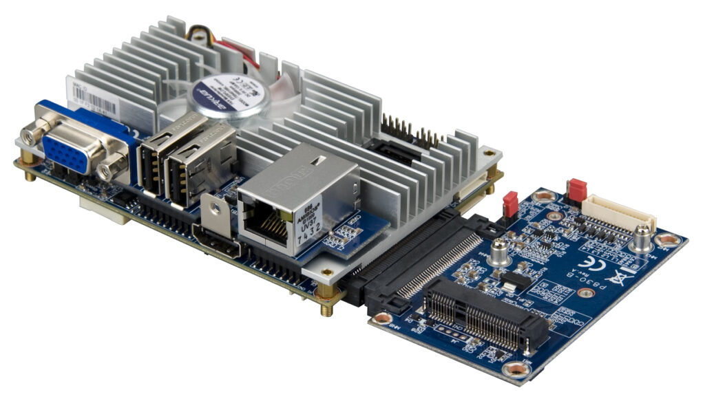 This is an image of the VIA EPIA-P830 Pico-ITX board which features the latest VX900 chipset with the P830-B expansion board and the option of an additional expansion board providing two Mini-PCIe ports – show at an angle.