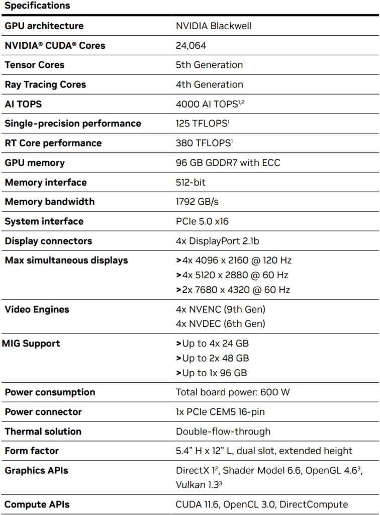 NVIDIA RTX PRO 6000 “Blackwell” ayrıca 32 GB RTX 5090’ın belleğinin 3 katı olan 96 GB GDDR7 bellekle birlikte geliyor. Bu, 1792 GB/sn toplam bant genişliği ve aynı 512 bit veri yolu boyunca sunuluyor. Kart, çift yuvalı form faktörüyle aynı çift akışlı tasarımda piyasaya sürülecek ve 4x 24 GB, 2x 48 GB veya 1x 96 GB modlarıyla MIG (Multi-Instance GPU / Çoklu Örnek GPU) yeteneğini destekliyor.