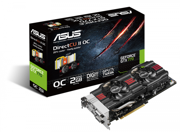 ASUS, 1536 CUDA çekirdekli, 28nm NVIDIA GTX 770 grafik işlemcisine ve 256-bit arayüz kullanan 2GB GDDR5 belleğe sahip GeForce GTX 770 DirectCU II OC ekran kartını duyurdu. Grafik işlemcinin hızı 1100MHz’e kadar çıkarken, bellekler de 7010MHz frekansında çalışıyor. GeForce GTX 600 serisinin DirectX 11 oyunlarda gösterdiği yüksek performansı artırarak devam ettiren kart daha yüksek performansı daha verimli bir şekilde sunuyor.