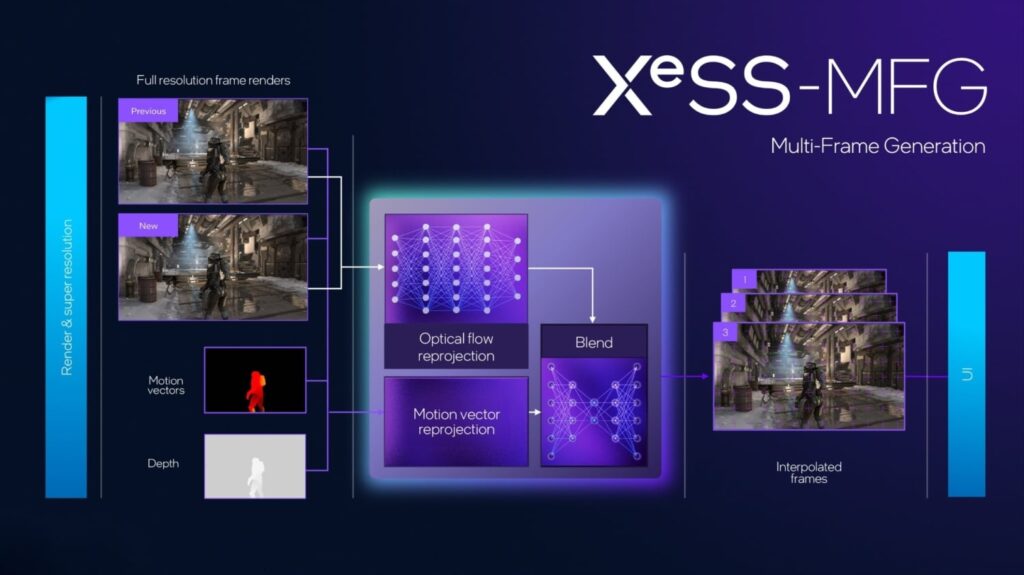 XeSS 3 Çoklu Kare Oluşturma, yapay zekâ destekli bir teknolojiyle, daha önce render edilmiş kareleri önceki kare verileri, hareket vektörleri, derinlik bilgisi ve diğer metriklerle birleştirerek yeni kareler üretiyor. Böylece oyunlarda daha yüksek kare hızı ve daha akıcı bir oynanış sağlanıyor. Nvidia’nın benzer teknolojisi DLSS 4 ile yapılan Çoklu Kare Oluşturma özelliği, sadece RTX 50 Serisi ile sınırlı iken, Intel bu desteği giriş ve orta seviye Arc GPU’lardan en üst seviyelere kadar herkese genişletmiş durumda.