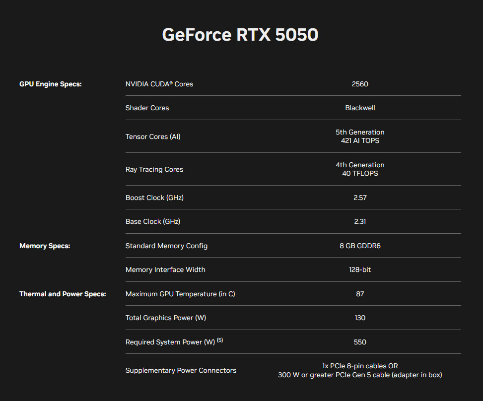 RTX 5050, TSMC’nin 5 nm üretim süreciyle geliştirilen GB207 GPU’sunu temel alıyor. Kartta 20 SM birimi, toplamda 2.560 CUDA çekirdeği, 20 ışın izleme ve 80 tensör çekirdeği bulunuyor. 128-bit bellek veri yolu ve 14 Gbps bellek hızıyla donatılan RTX 5050, modern oyunlarda tatmin edici bir performans vadediyor.