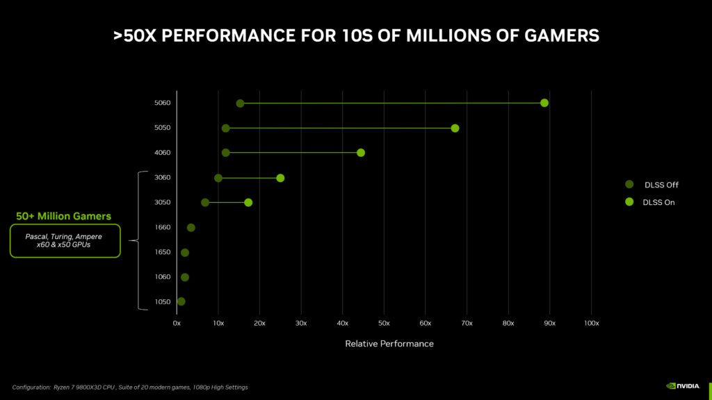 Nvidia, RTX 5050’in Cyberpunk 2077 gibi grafik yoğunluğu yüksek tek oyunculu oyunlarda, DLSS 4 ve çoklu kare üretimi teknolojisi sayesinde 150 FPS üzeri performans sunabildiğini belirtiyor. Şirket ayrıca, bu kartın önceki nesil RTX 3050’ye göre saf raster performansında yaklaşık %60 daha hızlı olduğunu ifade ediyor.