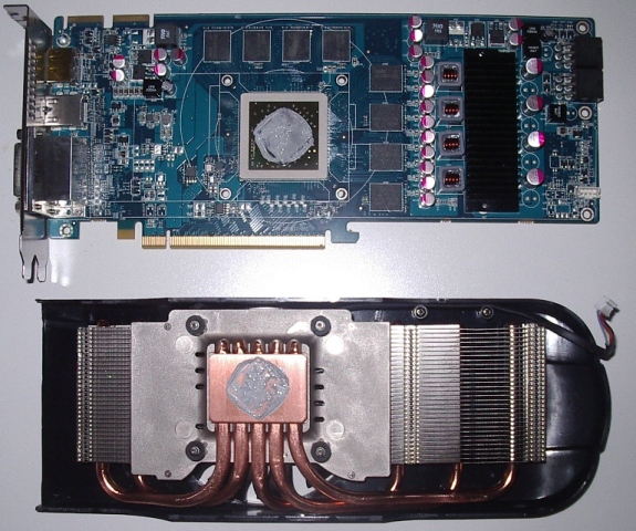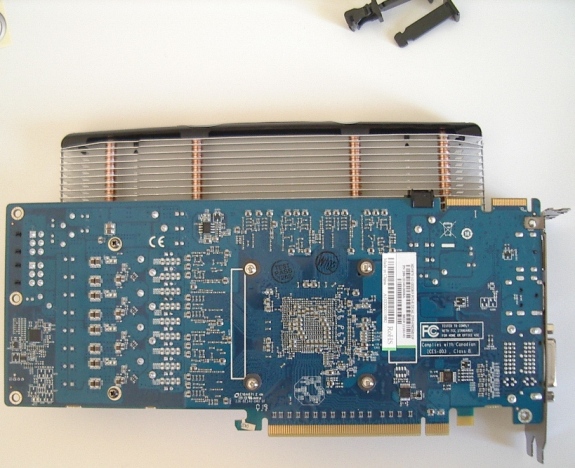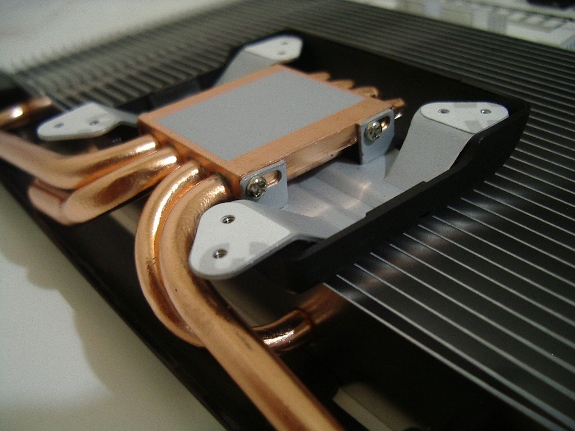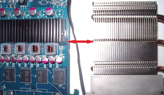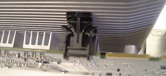 Bu soğutucunun en önemli handikapı, mosfet soğutucusu üzerine yeterince hava üfleyememesi. Alttaki resimde de görüldüğü üzere, mosfet soğutucusu üzerine kadar finlerin arası kapalı ve hava akımı, mosfetten sonra PCB üzerine geliyor. Kartın kendi soğutucusuyla en fazla ısınan yeri, bu mosfetler.