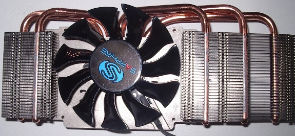 Sapphire HD5870 ekran kartımız, referans tasarım değil, versiyon 2 diye bilinen PCB üzerinde, oldukça iyi bir soğutucuya sahip bir kart. 6′şar mm kalınlığında 5 adet ısı borusu, bakır taban ile her birinde 31 sıra aluminyum fin bulunan iki ayrı kanat grubuna ısıyı iletiyor, 92 mm çapında özel kanat tasarımına sahip bir fan yardımı ile aktif soğutma sağlanıyor. Bu fan, %50 hıza kadar sessizce çalışıyor, %60 üzerinde fan sesi, tahammül sınırlarını aşıyor. Soğutucu üzerindeki plastik kabuğun da 6 pinlik PCIe güç kablolarını sökmeyi zorlaştırdığını belirtelim. Ram soğutucuları da mevcut değil.