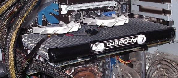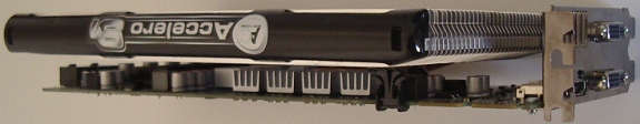 Soğutucuyu HD5870 üzerine monte ettikten sonra, artık 3 slot kaplıyor. Tabii esas karşılaştığımız sorun, Sapphire’in soğutucusundaki gibi, 6 pinlik PCIe güç kablolarını çıkartmak oldu.