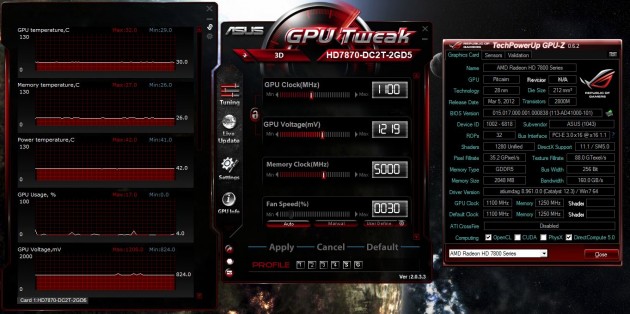 ASUS’un kendi grafik karları ve Radeon HD 7870 için de pakete dahil ettiği GPU Tweak yazılımı ile ince ayar ve hız aşırma kolayca yapılabiliyor. GPU Tweak ile grafik kartının çalışma hızlarını, voltajları ve fan performansını ayarlamanıza olanak sağlanıyor. Yazılımda standart ve gelişmiş modlar arasında farklı kullanıcı deneyimleri için seçenek de yer alıyor. Bu sayede kullanıcılar sadece hız aşırtma yapabildikleri gibi gelişmiş ayarlar sayesinde voltajları da kontrol ederek hız aşırmayı daha ileri seviyelere de taşıyabiliyorlar. ASUS, GPU Tweak ile GPU çalışma hızı, voltaj senkronizasyonunda sorunsuz ayarlama ve hız aşırmanın yanı sıra daha yüksek 3D mod değerlendirme noktaları sağlamak için 2D/3D geçişine de olanak sağlıyor. Bu sayede kullanıcılar sistem testleri için en ideal ayarları muhafa edebiliyorlar. ASUS Radeon HD 7870 Direct CU II’ile denemelerimizde çekirdek hızı 1315 MHz hafıza hızı ise 6190 MHz’e stabil olarak çıkabildi.