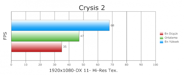 Crytek’in CryEngine 3 ile oyuncuların beğenisine sunduğu Crysis 2′yi extreme ayarlar ve son yayınlanan yüksek çözünürlüklü doku kaplamalarıyla test ettik. ASUS Radeon HD 7870 Direct CU II, en düşük 35 FPS alarak testimizi geçmeyi başardı.