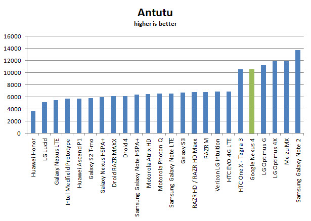 Fiyatına göre Google Nexus 4′ün inanılmaz bir hıza sahip olduğunu söylemek yanlış olmaz. Android 4.2′nin Project Butter özelliği sayesinde tereyağ gibi bir kullanıcı deneyimi sunuyor. Ana ekranlar arasında geçiş çok akıcı, uygulamalar anında açılıyor ve videolarda takılma sözkonusu değil. Antutu benchmark testlerinde 11.890 skoruna ulaşan Google Nexus 4, bu puanla Galaxy S3 (11.884) seviyesinde bir performansa sahip. Şu anda Galaxy Nexus 4′ü Antutu üzerinde performans açısından sollayan telefonlar LG Optimus G ve 4X, Meizu MX ve Samsung Galaxy Note 2.