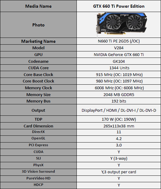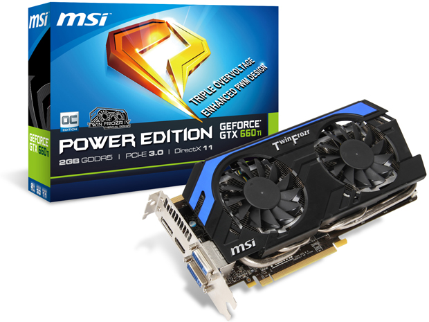MSI GeForce GTX660 Ti Power Edition 192 bit‘lik hafıza veriyolu ve 2048MB GDDR5 hafıza ile geliyor. GK104 kod isimli GPU’da baz frekans 915MHz ancak bu hız  otomatik olarak 980MHz‘e kadar yükselebiliyor. Overclocking altında ise hız 1097MHz‘e kadar çıkıyor. MSI’ın meşur “Military Class III” sınıfına dahil olan ürün zor şartlar altında(overclocking) maksimum stabilite ve ekstra uzun ömür gibi bir çok avantaja sahip.