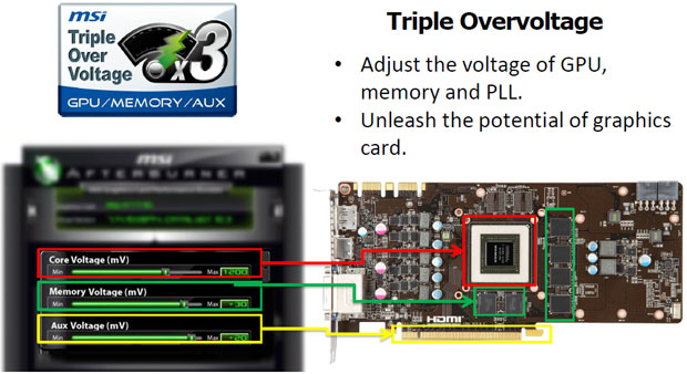Özelllikle overclocking meraklılarına yardımcı olacak özelliklerinden birinin adı “Triple Overvoltage” Bu özellik GPU, hafıza ve PCIe veriyolunun gerilimlerini sınırlarına kadar yükseltmenize imkan tanıyor. Overclocking sırasında ne kadar yüksek frekanslara çıkarsanız komponentlerinde o kadar yüksek elektriksel güçlere ihtiyacı oluyor. Triple Overvoltage burada imdada yetişiyor. Tabii ki “Power Edition” serisindeki geliştirilmiş PWM dizaynıda GPU’ya çok daha fazla akım gönderilebilmesine ve dolayısı ile daha yüksek oerclocking değerlerine ulaşılmasında önemli rol oynuyor.