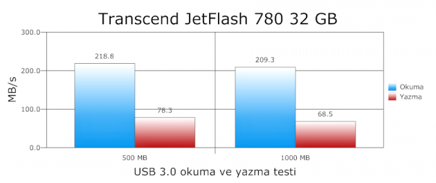 Transcend JetFlash 780 ise sunduğu yüksek okuma ve yazma hızlarıyla beğenimizi kazanıyor. Özellikle Transcend’in vaat ettiği 210 MByte/s okuma hızı ve 75 MByte/s yazma hızının altına düşmüyor. Yakın zamanda eğer hızlı bir USB 3.0 bellek almayı düşünüyorsanız Transcend JetFlash 780‘i tam size göre bir seçim olacaktır.