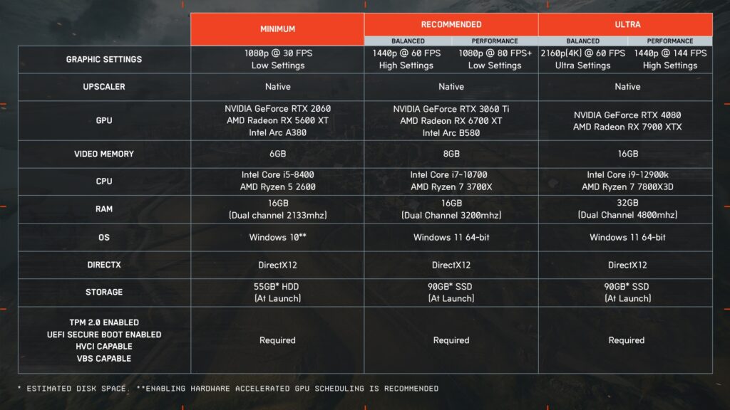 DICE, Battlefield 6’nın PC için kesinleşmiş sistem gereksinimlerini paylaştı. Oyunu 1080p çözünürlükte düşük ayarlarda ve yaklaşık 30 FPS performansla çalıştırmak için Intel Core i5-8400 veya AMD Ryzen 5 2600 işlemciye, 16 GB RAM’e ve NVIDIA GeForce RTX 2060, AMD Radeon RX 5600 XT ya da Intel Arc A380 ekran kartına sahip olmak gerekiyor. Depolama tarafında en az 55 GB boş alan isteniyor.