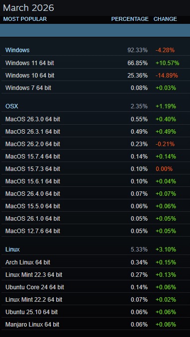 Steam kullanıcıları arasında Linux dağıtımları incelendiğinde, Valve’ın geliştirdiği SteamOS en büyük paya sahip. SteamOS tek başına Linux kullanıcılarının yaklaşık dörtte birini oluşturuyor. Ancak dikkat çeken nokta, büyümenin sadece SteamOS ile sınırlı olmaması; diğer Linux dağıtımları da giderek daha fazla kullanıcı çekiyor.