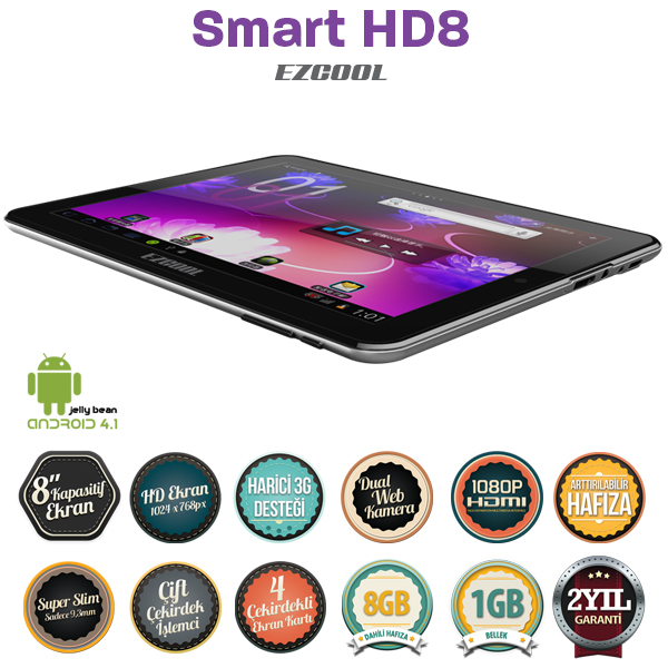 Kullanıcılara yüksek performans sunmak için tasarlanan Smart HD8, alüminyumdan üretilen arka kapağa sahip zarif kasasının içinde 1.5 GHz hızında çift çekirdekli bir işlemci (Rockchip RK3066 Dual Core), Quad Core (Dört çekirdekli) Mali 400 ekran kartı ve 1GB RAM barındırıyor. Bunun yanında Android’in en yeni sürümlerinden olan Android 4.1 Jelly Bean işletim sistemi ile donatılan Smart HD8, en yeni uygulamaları kullanmak ve oyunları oynamak için ideal bir tablet.Görüntülü görüşme için ön kamera ve arkada 2MP kameraya sahip olan Smart HD8, 299 TL fiyatla satışa sunulmuş durumda.