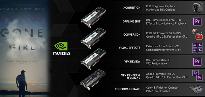 Filmin yapımcıları, prodüksiyonun bütün aşamalarında NVIDIA’nın Quadro K5200 GPU’larını kullandı. Bu durum, Kayıp Kız’ın çekim, yayın ve görsel efekt (VFX) ekipleri için organize bir inceleme süreci sağlayarak, yaratıcı bir düzenleme için 6K kazançtan 2.5K’ya olmak üzere, formatlar arasında hızlı dönüşüm sağladı.