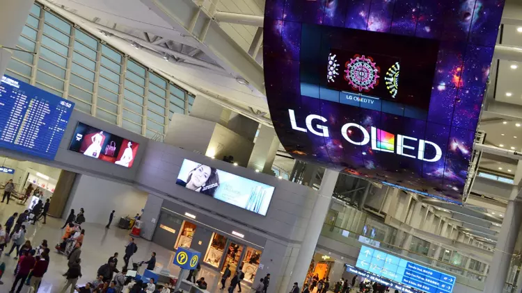 Hava alanı tavanında 140 x 55-inç kavisli 4K OLED TV, 13 metre yüksekliğinde ve 8 metre genişliğinde bir alanı kaplıyor.