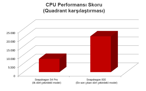 Qualcomm Technologies‘in geçen yıl piyasaya sürdüğü dört çekirdekli Qualcomm Snapdragon S4 Pro işlemcinin görüntü performasını gösteren aşağıdaki grafiğe göz atabilirsiniz. Yanında ise en yeni Snapdragon işlemcisi olan ve yine dört çekirdeğe sahip olan Snapdragon 800’e ait sonuçlar yer alıyor. Çekirdeki sayısı aynı kalmasına rağmen yeniden yapılandırılan Snapdragon 800 yüzde 170‘lik bir performans artışı ortaya koyuyor.