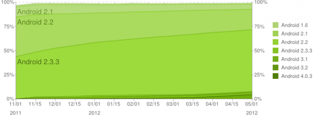 Android 3.3 Honeycomb versiyonu %3.3 seviyesinde kalırken Android cihazlarda en yüksek oran, 2.3 sürümü olan Gingerbread sürümüne ait. Nisan ayında %63.7 olan Gingerbread dağılımı şu anda %64.4 seviyesinde.