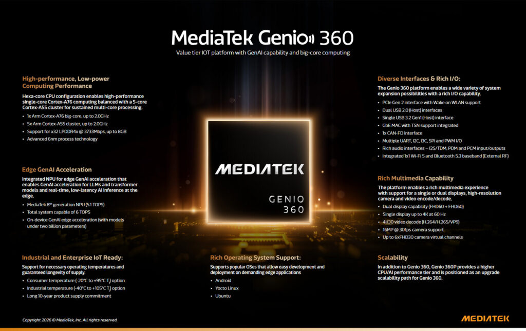 MediaTek’in Genio IoT platformu, yüksek performanslı fakat enerji verimli yapay zekâ işlem gücünü gelişmiş bağlantı özellikleriyle birleştirerek edge AI tabanlı yeni nesil IoT cihazlarının geliştirilmesini hızlandırmayı amaçlıyor.