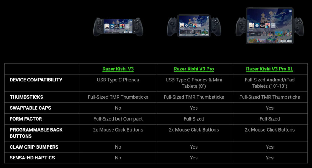 Standart V3’a göre daha büyük olan V3 Pro XL, tam boyutlu TMR joystikleriyle (manyetik sensörlü, drift yapmaz), geliştirilmiş ergonomik tutuşuyla ve ayarlanabilir makro tuşlarıyla dikkat çekiyor. V3 ($99,99) ve V3 Pro ($149,99) ile paylaştığı bu özelliklere ek olarak, XL model haptik geri bildirim desteğine de sahip ancak bu özellik yalnızca Android’de veya USB‑C üzerinden PC’ye bağlandığında aktif oluyor.