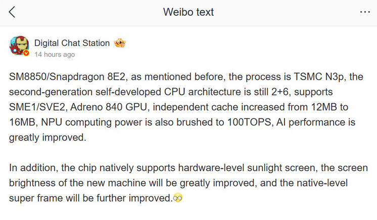 Teknoloji sızıntılarıyla tanınan Dijital Sohbet İstasyonu (DCS), Qualcomm’un henüz duyurulmamış “Snapdragon 8 Elite Gen 2” mobil çipi hakkında yeni detaylar paylaştı. DCS, daha önce SM8850 kod adıyla anılan bu yonganın önemli nesil atlamalarıyla geleceğini öne sürmüştü. Son bültenine göre, çipin yapay zeka işlem gücü 100 TOPS seviyesine ulaşarak mobil cihazlarda daha gelişmiş AI özelliklerinin önünü açacak.
