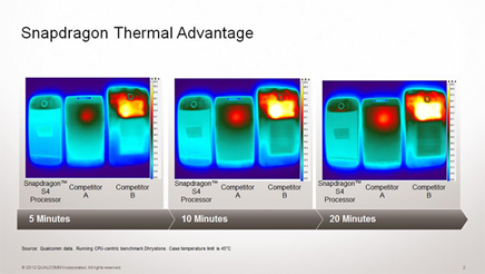 Mobil işlemcilerin verimini tartıştığımızda aklımıza genellikle Qualcomm’un da Snapdragon işlemcileriyle her zaman için daha uygun hale getirmek üzere yoğunlaştığı bir alan olan pil ömrünü getiriyoruz. Termal verim eskisi kadar sıklıkla tartışılmasa da kullanıcı deneyiminin kalitesi üzerinde ciddi bir etkisi olabiliyor. Aşağıdaki videoda göreceğiniz gibi, Qualcomm, Snapdragon işlemcilerinin cihazın zirve performansında dahi serin kalması için var gücüyle çalışıyor. Özetle, düzenli olarak yüzünüzle temas ettirdiğiniz cihazınız tereyağını eritecek kadar ısınmıyor.