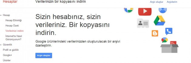 “Sizin hesabınız, sizin verileriniz.. Bir kopyasını indirin” sloganıyla Google, Takvim ve Gmail hesaplarınıza ait verileri bilgisayarınıza indirme olanağı tanıdığını açıkladı. Google hesap sayfanızdan “Verilerinizi indirin” bağlantısına tıklayarak ceri arşivleri oluşturabilirsiniz. Gmail ve Takvim verilerine ek olarak Youtube, Google+ ve Drive gibi tüm Google hizmetlerini kapsayan arşivler oluşturabilirsiniz.