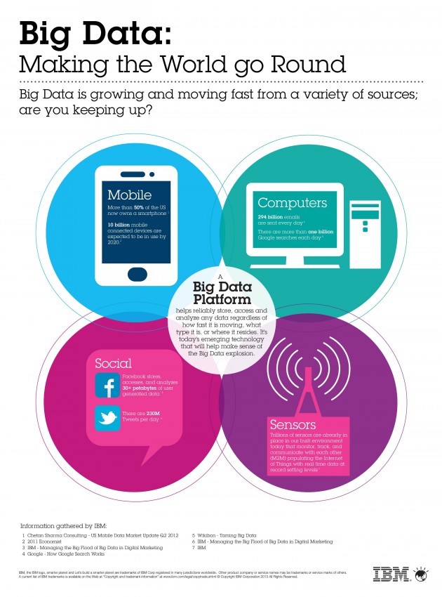 Yeni IBM ürünleri, yazılım, hizmetler, araştırma ve donanımı kapsayan sektörün en geniş Büyük Veri portföyünü bir adım ileri taşıyor. IBM Büyük Veri Platformu, geleneksel veri ambarı teknolojilerini Hadoop, akış bilgi işlemi (stream computing) veri keşfi, analitik ve kurumsal entegrasyon gibi yeni Büyük Veri teknikleriyle bir araya getirerek kritik gereksinimlere yanıt vermek için bütünleştirilmiş bir çözüm oluşturuyor.