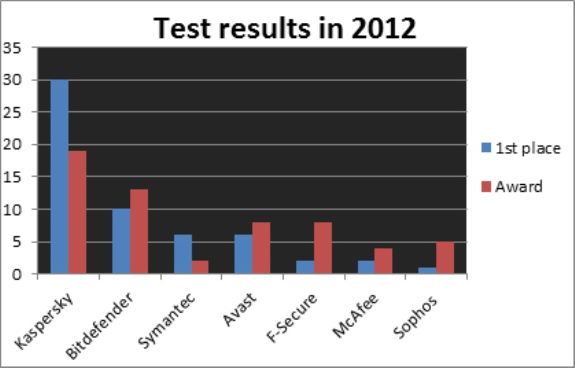 2012 Yılında bağımsız kuruluşlarca yapılan ve katıldığı 57 adet testin 30 tanesini birincilikle tamamlayan, 19 tanesinden ise ödül alan Kaspersky yazılımları, 2011 Yılında da çeşitli kuruluşlarca en başarılı güvenlik yazılımı olarak seçilmişti.