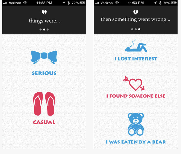 Sizi bir ayı yediği için artık birlikte olamayacağınızdan eski okul öğretmeninize aşık olduğunuza kadar çeşitli bahaneler ile ayrılabilmenize olanak tanıyan uygulama, kullanıcıların kendi mesajları ile dünyanın mutsuz çiftlerine katkıda bulunmalarına da izin veriyor.