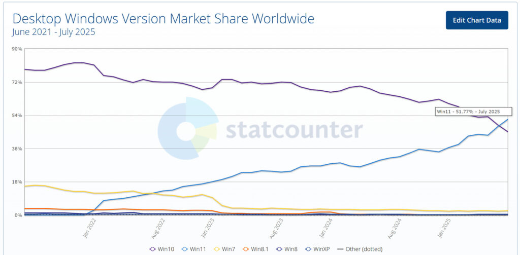Statcounter’ın Haziran 2025 verilerine göre, Windows 11, dünya genelinde ilk kez Windows 10’u geçerek en yaygın kullanılan masaüstü işletim sistemi oldu. Yavaş benimsenmesine rağmen, Windows 11 Haziran ayında %34,7’lik bir pazar payına ulaşarak Windows 10’un %33’e düşmesine neden oldu.